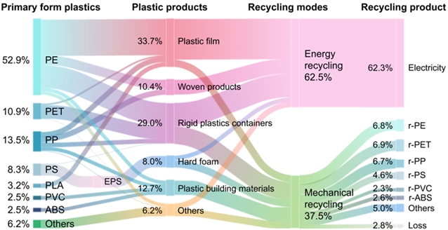 图2 南京市MLPW产生与回收的物质流。该图展示了材料组成和端到端的去向。图的左侧用不同颜色代表聚合物类型,右侧的流向代表处理路径。粉色代表焚烧,绿色代表机械回收,前缀“r”代表回收的材料。