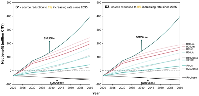 图4 2020至2060年不同情景下MLPW管理的全生命周期净经济效益。S0情景代表城市生活塑料垃圾(MLPW)到2035年继续保持1.5%的增长率(黑线)。S1(左图)和S2(右图)情景代表自2035年起MLPW的增长率分别为1%和0%,并结合了生物材料替代(R)和回收利用(U)措施。