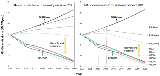 图3 2020至2060年不同情景下MLPW处理的预测碳排放量。S0情景(黑线)代表自2035年起MLPW继续保持1.5%的增长率。左图(S1)和右图(S2)分别代表自2035年起增长率降为1%和0%,并结合了生物材料替代(R)和回收利用(U)措施的各种组合曲线。