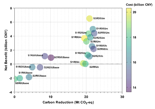 图5 MLPW管理的成本效益分析。展示各情景的经济成本、效益及其在碳减排方面的潜力。