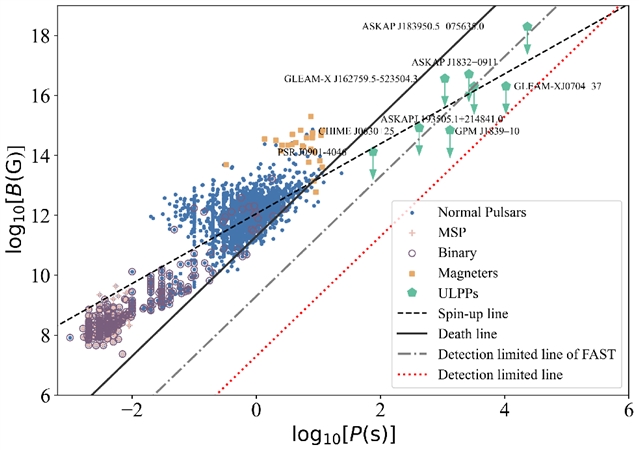 脉冲星作为转动中子星的辐射表现形式,其分类依赖参数之一是自转周期与磁场强度分布。FAST的高灵敏度使其在发现“奇特脉冲星”方面具有独特优势,这类天体对理解极端物理过程至关重要。通过脉冲星周期-磁场分布图(P-B图)可清晰区分不同类型脉冲星的物理特性。