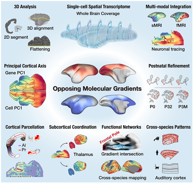 Abstract: The principles organizing cellular diversity and connectivity in primate brains remain elusive. By integrating spatial transcriptomics, magnetic resonance imaging, and retrograde labeling in marmosets, we identified two opposing molecular gradients that undergo postnatal refinement, emanating from allocortices and primary sensory cortices, respectively. These gradients reconcile conflicting hypotheses on cortical expansion and characterize distinct cortical areas. Cortical gradients align with thalamic gene expression and thalamocortical projection patterns. At gradient intersections, the default mode network and frontal pole exhibited similar molecular features in humans and marmosets, despite species-specific differences in functional connectivity. Comparative analysis of gradient-related genes showed that marmoset and human auditory cortices are highly similar but differ from those of macaques, potentially reflecting complex vocalization. Together, these opposing gradients represent a fundamental organizing principle of the primate cortex.