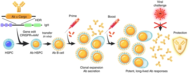 Abstract: Long-term in vivo production of therapeutic proteins and development of vaccines that elicit protective levels of broadly neutralizing antibodies (bNAbs) against major pathogens face challenges. In this study, we report on an alternative gene editing approach using small numbers of hematopoietic stem and progenitor cells (HSPCs) to direct long-term, high-level expression of antibodies or cargo proteins. In mice, edited B lymphocytes derived from transplanted HSPCs were activated by cognate antigen, underwent clonal expansion, and developed into specific antibody-synthesizing or cargo protein–synthesizing plasma cells. These cells produced long-lasting, therapeutic levels of serum antibody against HIV-1, malaria, or an anti-influenza virus bNAb that mediated universal protection from heterologous lethal challenge. Our data provide a paradigm for cell therapy approaches to prevent or treat disease using self-amplifying B cell protein factories.