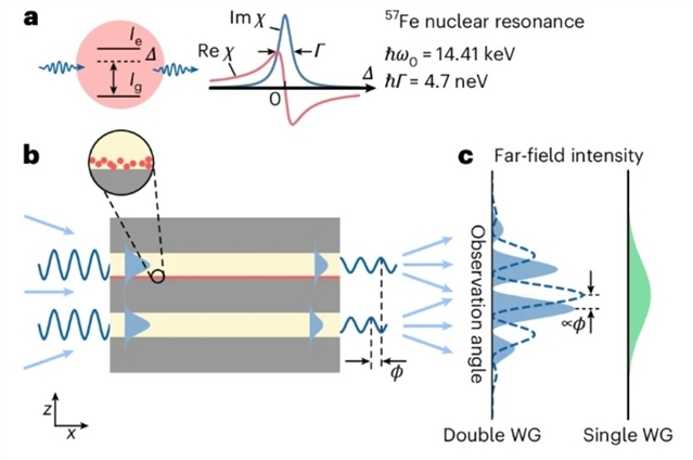 研究组受杨氏双缝实验启发,展示了一种纳米尺度干涉仪,用于测量由穆斯堡尔同位素57Fe的14.4 keV核共振耦合至X射线波导所产生的色散相位偏移。利用单光子干涉图样,结合贝叶斯推断,研究组精确提取了核共振附近随光子能量变化的相位偏移。他们发现,相位偏移与吸收率的联合信息揭示了仅凭吸收测量无法获取的微观耦合参数。所展示的原理为集成式X射线干涉测量传感器奠定了基础。