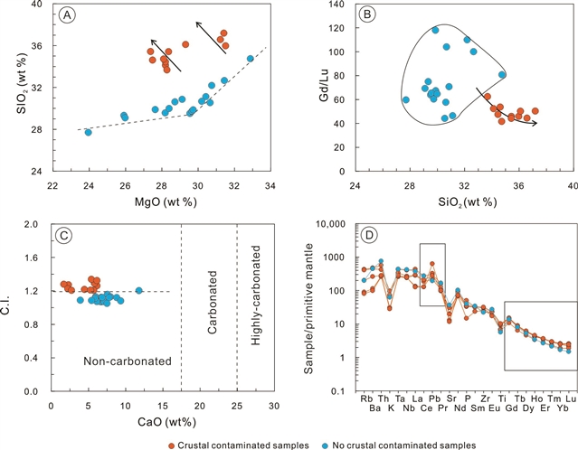 图1. 瓦房店地壳混染金伯利岩样品和未混染样品的SiO2 vs MgO图解(A),Gd/Lu vs SiO2图解(B);地壳混染指数图解(C.I.)(C);和原始地幔标准化微量元素图解(D)。地壳混染样品表现出正SiO2和Pb异常以及升高的重稀土(HREE)含量。