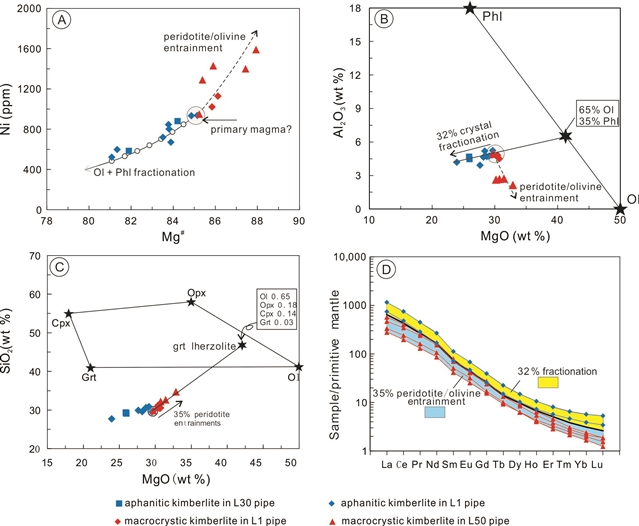 图2. 瓦房店金伯利岩Ni vs Mg指数图解(A)、Al2O3 vs MgO 图解(B)、SiO2 vs MgO图解(C)和稀土元素配分图(D)。隐晶质金伯利岩的成分变化表明这些岩石发生了最高达32%的橄榄石和金云母分离结晶作用,粗粒金伯利岩样品成分变化是由最高达35%的地幔橄榄岩捕获体引起。