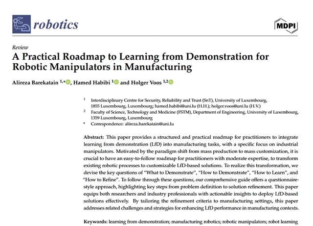 本文以工业机械臂为中心,将演示学习(LfD)融入制造任务中,提供了一份结构化且实用的路线图综述。