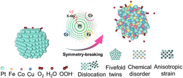 Abstract: Understanding and controlling atomic-level interactions within multicomponent alloys provides a promising avenue to drive multistep tandem catalysis. Herein, we develop an atomic symmetry-breaking PtFeCoCu multicomponent alloy that disrupts long-range order and local coordination homogeneity and identify the nature of its enhanced performance for oxygen reduction reaction (ORR). The deliberate symmetry breaking, featured by heterogeneous local coordination and anisotropic strain, enriches the Pt environment with additional transition-metal neighbors. These distortions activate multicomponent interactions and tune the Pt electronic structure, promoting ORR intermediate conversion while suppressing component dissolution. Consequently, PtFeCoCu reaches a half-wave potential of 0.95 VRHE and a mass activity of 3.53 A mgPt1 at 0.9 VRHE in ORR. In an H2-O2 fuel cell, it delivers a high mass activity of 1.63 A mgPt1 at 0.9 ViR-free, retaining 87.7% of its initial mass activity after 30,000 cycles. Our findings highlight symmetry breaking as a key driver with broad implications across multicomponent alloys.
