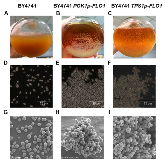 图1出发菌株BY4741及FLO1天然启动子替换菌株BY4741 PGK1p-FLO1和BY4741 TPS1p-FLO1的絮凝表型。A至C目测观察。 D至 F,光学显微镜。 G至 I,扫描电子显微镜。
