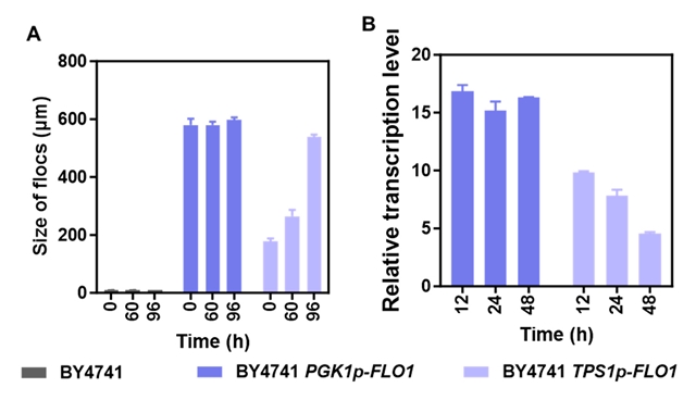 (2) 系统表征,明确絮凝强度与动态变化: 聚焦光束反射测量(FBRM)动态监测表明BY4741 PGK1p-FLO1形成稳定的粗大絮团,絮凝直径为585 μm且尺寸不随发酵时间改变;BY4741 TPS1p-FLO1的絮团则呈动态增长,平均直径从178 μm逐步增至539 μm(图2)。结合转录分析,该菌株絮凝粒径的增大与其FLO1表达水平随发酵时间的上调趋势相符合,证实了TPS1p启动子的诱导活性驱动了絮凝强度的动态变化。上述结果表明,系统整合絮凝率与动态粒径监测,可有效解析不同启动子驱动的絮凝特征,为明确絮凝强度及其动态变化规律提供关键依据。