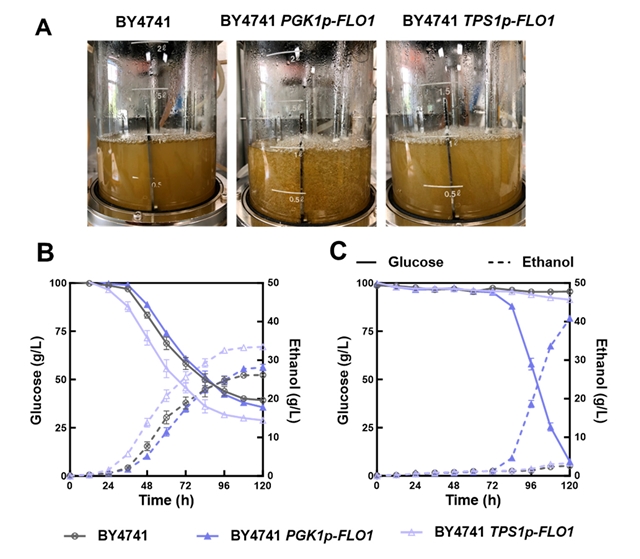 (1) 精准调控,构建强弱絮凝酵母: 研究团队利用CRISPR-Cas9技术,在非絮凝实验室菌株BY4741中,将其天然 FLO1 启动子替换为强组成型启动子PGK1p和乙醇诱导型启动子TPS1p,分别获得了强絮凝菌株BY4741 PGK1p- FLO1 和中度絮凝菌株BY4741 TPS1p- FLO1, 絮凝颗粒的表型见图1。