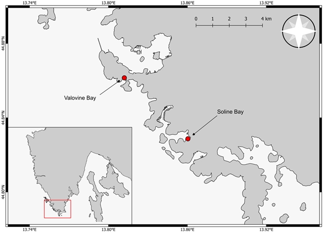 研究区域:研究选取了南伊斯特里亚的两个典型海湾 —— 瓦洛维纳湾(Valovine Bay)和索林湾(Soline Bay)。这两个海湾地理位置相近,但环境特征差异显著,形成了天然的对照体系。