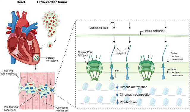 在这项工作中,研究人员研究了机械负荷的作用,并在体内癌症模型和离体工程心脏组织中进行了主题研究,以表明机械负荷可减少心肌中癌细胞的增殖。人类心脏转移瘤的空间转录组学显示组蛋白甲基化和染色质压实减少。这些变化影响增殖相关位点的染色质可及性,Nesprin2被认为是一个关键的机械传感器。他们的研究结果揭示了机械力是如何保护心脏免受癌症侵害的,并提出了基于机械刺激的癌症治疗的潜在策略。