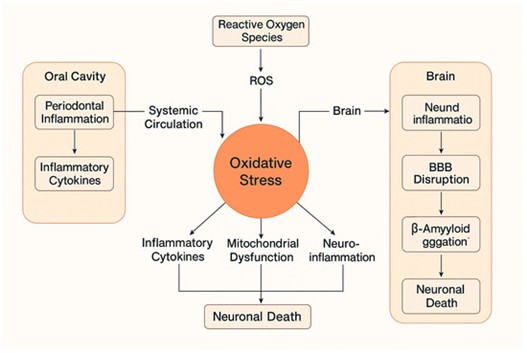 作者在文中系统梳理了牙周炎引发全身性损害的病理路径。牙周炎不仅是局部的口腔问题,其产生的促炎细胞因子和致病菌(如牙龈卟啉单胞菌)可以通过血液循环和神经通路(如三叉神经)到达大脑。研究指出,这种慢性炎症环境会导致活性氧(ROS)的产生与抗氧化防御系统之间出现严重失衡,即产生氧化应激。