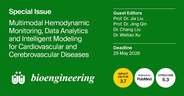 基于此,Bioengineering 期刊邀请了中国科学院深圳先进技术研究院的刘嘉教授,香港理工大学的秦璟教授,中国科学院深圳先进技术研究院的刘畅博士,香港城市大学的徐伟涛博士和中山大学附属第八医院的杜健航博士创建特刊“Multimodal Hemodynamic Monitoring, Data Analytics and Intelligent Modeling for Cardiovascular and Cerebrovascular Diseases (心血管和脑血管疾病的多模式血流动力学监测、数据分析和智能建模)”。本特刊涵盖多模态血流动力学监测、信号处理、数学建模和人工智能在心血管和脑血管疾病中的应用。我们欢迎高质量的投稿,包括原创研究和综述。