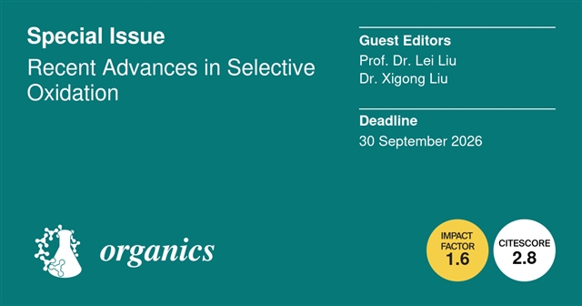 Organics期刊特邀山东大学化学与化工学院的刘磊教授及刘希功副研究员共同推出特刊Recent Advances in Selective Oxidation(选择性氧化的最新进展)。我们诚挚邀请广大研究人员围绕“选择性氧化”这一主题,踊跃投递具有新颖性与开创性的研究成果,共同推动该领域向前发展。