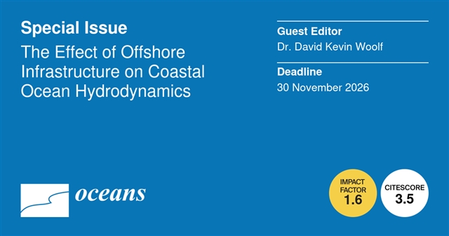 Oceans 邀请了英国爱丁堡赫瑞瓦特大学生命与地球科学研究所的David Kevin Woolf博士建立特刊“The Effect of Offshore Infrastructure on Coastal Ocean Hydrodynamics”,本期特刊旨在汇集相关研究成果,探讨影响水动力学的任何近海海洋基础设施。特刊重点阐述利用所有研究方法,包括现场观测、卫星和海岸雷达遥感、以及任何相关尺度的数值模拟来监测近海可再生能源基础设施的影响。研究内容可以涉及生态效应或污染问题,但应以物理机制为基础,例如流场变化或水体分层的改变。特刊关注领域包括但不限于以下主题: