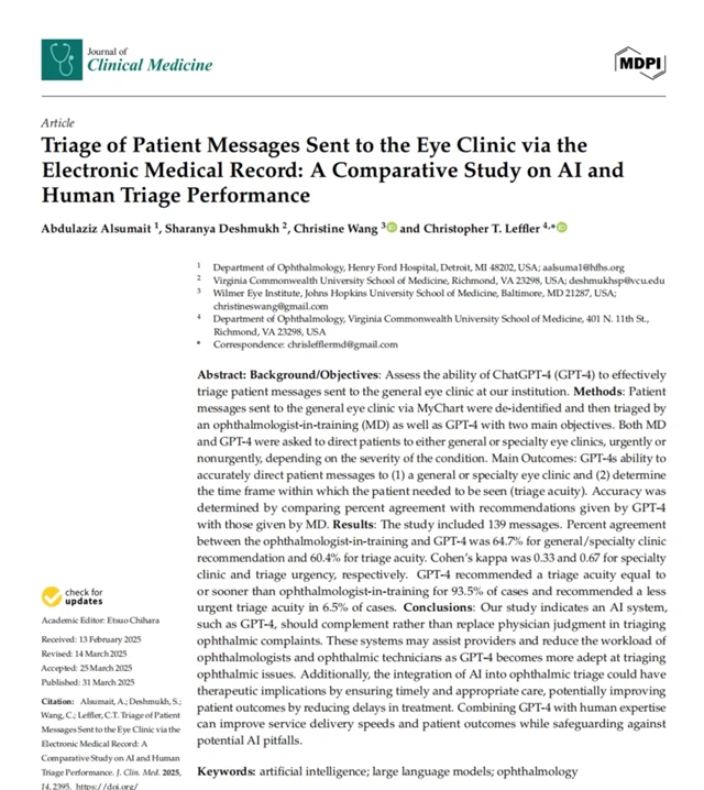 本研究对GPT-4在真实眼科临床场景中的分诊能力进行评估。研究发现,GPT-4与临床医生在专科分诊建议的一致性为64.7%,在紧急程度判断的一致性为60.4%。虽然GPT-4在多数情况下表现出保守分诊倾向 (93.5%案例建议更早就诊),但6.5%的案例中存在低估临床紧急程度的潜在风险。本研究提示,AI系统需结合患者完整临床资料,并在医生监督下使用,以降低分诊失误可能导致的风险。