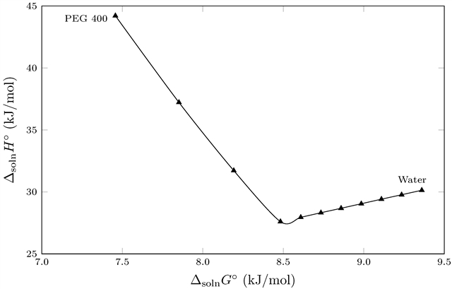 图例:异烟肼(3)在{PEG 400 (1) + 水 (2)}混合物中溶解度的焓熵补偿图,温度为Thm = 302.82 K。