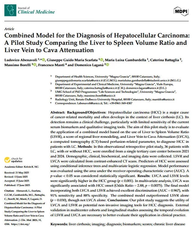 本文利用CT影像开发了肝脾体积比和肝静脉-腔静脉衰减比联合模型,用于诊断肝硬化患者中肝细胞癌 (Hepatocellular Carcinoma, HCC) 的可行性研究。