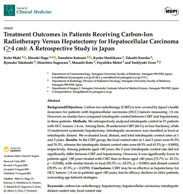 本研究通过回顾性队列分析,比较了碳离子放疗与肝切除治疗直径≥4厘米的肝细胞癌患者的肝内控制效果 (包括局部和远处控制),并特别分析了年龄对治疗效果的影响。
