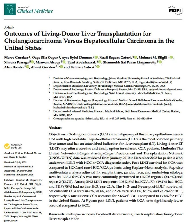本文通过分析美国2010–2022年的器官移植数据,比较了活体肝移植治疗胆管癌与肝细胞癌患者的术后生存率,发现胆管癌患者移植后5年生存率显著低于肝细胞癌患者。