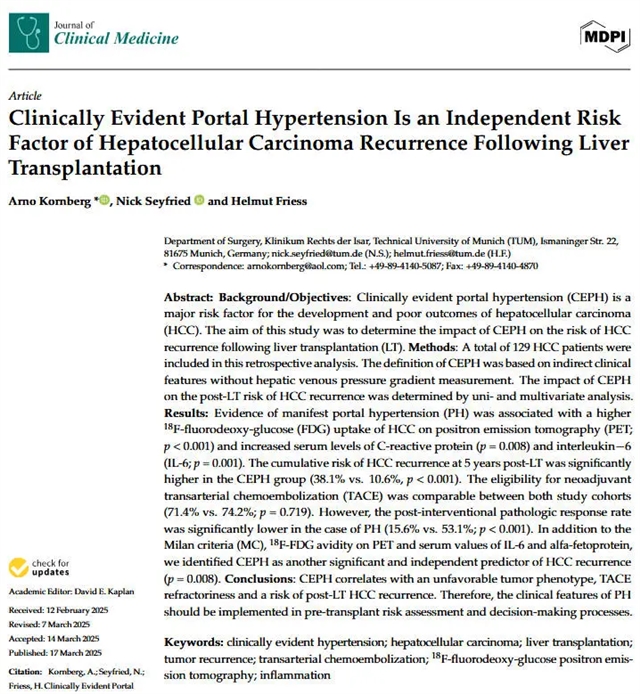 本研究回顾性分析了129例肝细胞癌肝移植患者,证实临床上明显的门静脉高压是肝移植术后肿瘤复发的独立危险因素。