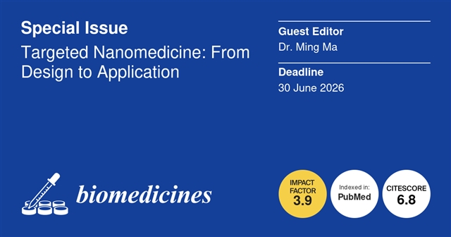 Biomedicines 邀请了中国科学院上海硅酸盐研究所马明博士,合作创建特刊“Targeted Nanomedicine: From Design to Application (靶向纳米药物:从设计到应用)”。本特刊旨在展示靶向纳米药物在克服传统疗法局限性方面的变革潜力,期望汇集前沿突破,促进前景广阔的平台成果从实验室到临床的加速转化。特刊欢迎高质量投稿,涵盖靶向纳米药物的全链条研究。主题包括但不限于:
