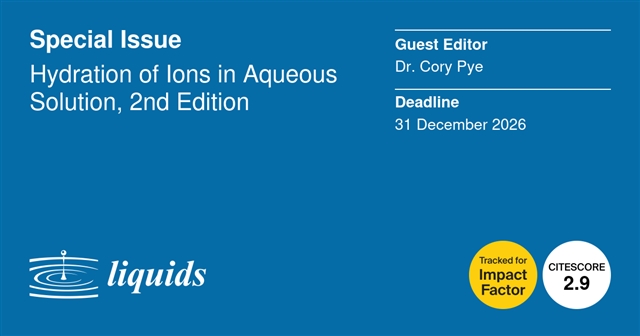 离子水合是理解电解质溶液理化性质的核心研究方向,其相关机制与规律在化学、材料、生物、地质等多领域具有关键应用价值。为进一步推动离子水合领域的研究交流与成果创新,Liquids (ISSN 2673-8015; https://www.mdpi.com/journal/liquids) 特开设“水溶液中的离子水合 (Hydration of Ions in Aqueous Solution) 第二卷”特刊,由加拿大圣玛丽大学Cory Pye博士担任客座编辑,现面向全球科研工作者公开征稿。