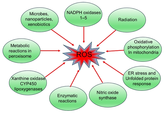 图1. 活性氧的主要来源:包括线粒体电子传递链、NADPH氧化酶、解偶联的eNOS、黄嘌呤氧化酶等。这些来源在糖尿病状态下被激活,导致氧化应激水平显著升高。