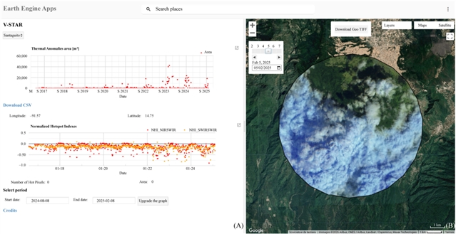 图2.V-STAR界面。(A)显示所选火山的不同信息;(B)显示与所选火山相关的Sentinel-2 MSI图像以及用于更改日期的日历。