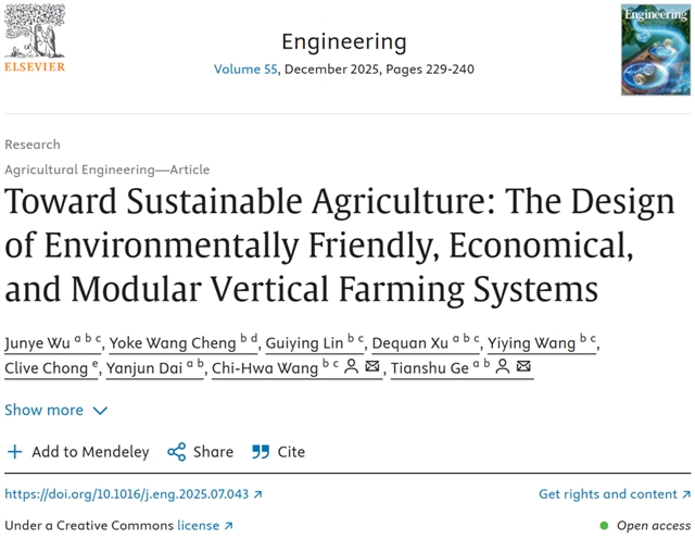 Junye Wu, Yoke Wang Cheng, Guiying Lin, Dequan Xu, Yiying Wang, Clive Chong, Yanjun Dai, Chi-Hwa Wang, Tianshu Ge, Toward Sustainable Agriculture: The Design of Environmentally Friendly, Economical, and Modular Vertical Farming Systems, Engineering, Volume 55, 2025, Pages 229-240. DOI: 10.1016/j.eng.2025.07.043