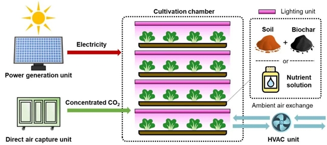 图1. 一种环境友好、经济实用且模块化的垂直农业系统设计。蔬菜在封闭式种植舱内采用垂直布局,可分别使用营养液或添加生物炭的土壤作为水培或土壤栽培的种植基质。土壤栽培中通过顶部灌溉单元分配水分;水培则无需额外灌溉。人工光照单元为作物生长提供照明,CO2富集通过直接空气捕集(DAC)单元实现,室内环境由暖通空调(HVAC)单元调控,系统运行所需能量由能量生产单元供给。