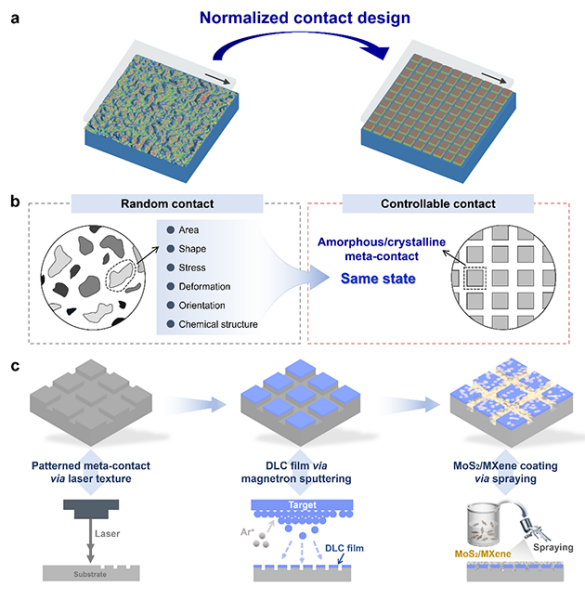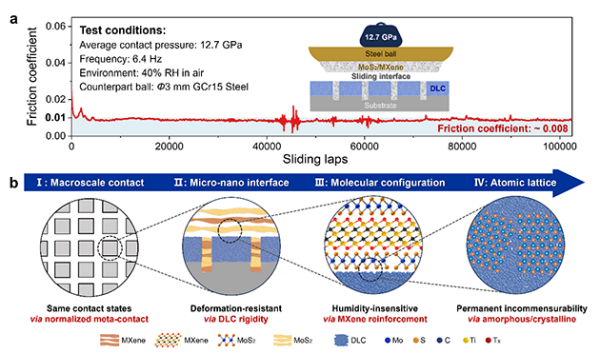 团队通过激光织构构建规则的接触阵列,将宏观面接触归一化为无数等同的微米级单元接触,使每个单元的接触状态保持一致。在每个接触单元表面,团队构筑了刚性非晶类金刚石碳(DLC)膜层/柔性晶体MoS2配副滑移元界面,削弱接触界面在极端高接触压力下的形变;进一步采用MXene作为增强与锚定剂,使晶体MoS2在极端高接触压力和大气环境下保持完整的层状结构,维持超润滑界面的稳定。团队还揭示了运动过程中原子晶格匹配的动态偏转微观机制,发现了非晶DLC/晶体MoS2永久非公度接触特性,从根本上消除了晶格匹配所导致的原子互锁。