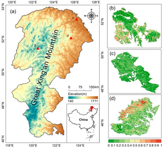 图1:大兴安岭山脉(位于中国东北部)的位置。三张由陆地卫星数据计算得出的相对差异归一化燃烧比(RdNBR)图像分别展示了三场极端火灾事件的燃烧严重程度模式:根河火灾(b)、胡马火灾(c)和坎杜赫火灾(d)。RdNBR 被用于量化火灾后的生态系统变化(见 b - d)。RdNBR值表示烧伤的严重程度。