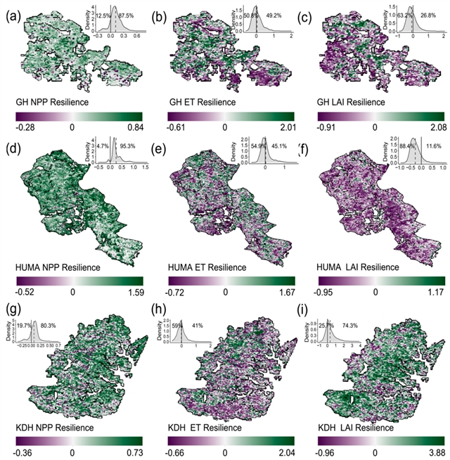 图 2. 基于 MODIS 对格雷特森林火灾(a - c)、胡马森林火灾(d - f)和凯德森林火灾(g - i)的结构和功能参数观测所得的生态系统恢复力的空间分布图。灰色的概率密度函数图展示了净初级生产力(a、d、g)、蒸散量(b、e、h)和叶面积指数(c、f、i)的恢复力值分布。虚线代表评估所得恢复力的平均值。