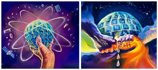 图1. 人类世的心态:在享乐主义,利己主义,和消费主义的推动下,自工业革命以来,对自然的攫取、剥削不断加剧。无节制的“经济”增长意识形态占据主导地位,取代了原住民传统的与自然和谐相处的生存智慧,原住民认识到人与自然的关系应当是互惠与平衡(艺术作品由作者Professor Susan L. Prescott创作)。