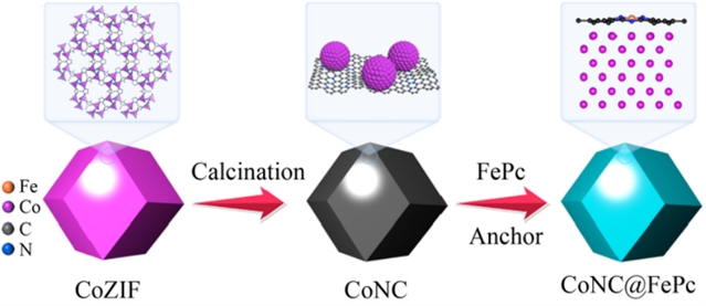 氧还原反应(ORR)与氧析出反应(OER)作为金属-空气电池和燃料电池的关键过程,其催化效率与稳定性直接影响能源转换与存储技术的实际应用。针对贵金属催化剂成本高、稳定性差等问题,本研究通过将分子铁酞菁(FePc)锚定于ZIF-67衍生的钴-氮共掺杂碳基体(CoNC),构建了一种高效的双功能氧催化剂(CoNC@FePc)。该催化剂通过钴纳米颗粒(Co NPs)与FePc分子间的强电子相互作用,显著提升了ORR/OER的催化活性与循环稳定性。