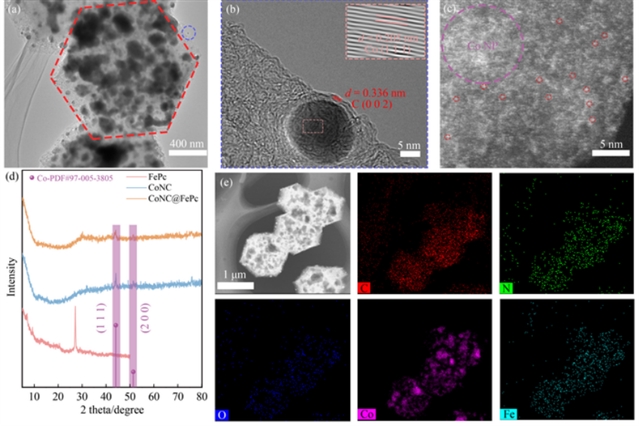 本研究采用两步法合成CoNC@FePc催化剂。首先,通过高温热解Co-ZIF前驱体获得CoNPs嵌入的氮掺杂碳基体(CoNC),其比表面积达106.2 m2/g,介孔结构有利于质量传输。随后,通过溶液浸渍法将FePc分子锚定于CoNC表面,形成了CoNPs与FePc的紧密界面。透射电镜(TEM)与球差校正高角环形暗场扫描透射电镜(AC-HAADF-STEM)表征显示,CoNC@FePc保留了前驱体的六方结构,CoNPs与FePc分子均匀分布于碳基体中。X射线光电子能谱(XPS)分析表明,FePc的引入诱导Co 2p3/2结合能正向偏移了0.9 eV,证实Co与FePc间存在显著的电荷转移,优化了活性位点的电子环境。