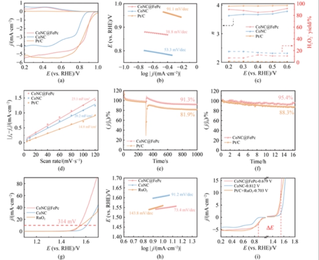 电化学性能测试显示,CoNC@FePc在0.1 M KOH电解液中表现出优异的ORR/OER双功能活性。旋转环盘电极(RRDE)测试表明,其ORR半波电位与扩散极限电流密度均超越了Pt/C,Tafel斜率显著低于CoNC,表明其具有更快的反应动力学。此外,CoNC@FePc的OER过电势较RuO2降低了17 mV,且双功能电压间隙优于Pt/C+RuO2组合。耐久性测试中,由于CoNPs的稳定锚定与碳基体的抗腐蚀特性,CoNC@FePc在16小时恒电位运行后电流保持率达95.4%,甲醇耐受性较Pt/C提升了2倍。