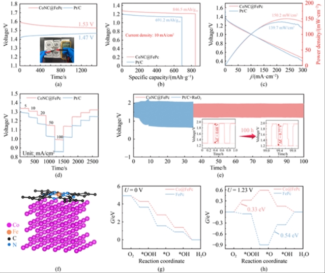 为验证其实际的应用潜力,研究人员组装了CoNC@FePc基的锌空气电池(ZAB)。结果显示,其开路电压达1.53 V,峰值功率密度为150.2 mW/cm2,较Pt/C基电池提升了7.5%。在10 mA/cm2电流密度下循环100小时后,充放电电压间隙仅增加了0.747 V,显著优于Pt/C+RuO2体系。根据密度泛函理论(DFT)计算进一步揭示了该过程的催化机制:CoNPs与FePc的界面电子转移降低了O→OH转化的能垒,使ORR速率决定步骤(RDS)能垒较纯FePc降低了39%;同时,CoNPs促进了OH→O的脱质子过程,将OER的RDS能垒从0.84 eV降至0.44 eV,揭示了双金属协同效应的原子级起源。