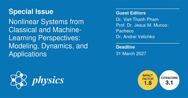 Physics邀请了胡志明市工业大学Dr. Viet-Thanh Pham,普埃布拉功勋自治大学(BUAP)Prof. Dr. Jesus M. Munoz-Pacheco和彼得罗扎沃茨克国立大学Dr. Andrei Velichko合作建设特刊Nonlinear Systems from Classical and Machine-Learning Perspectives: Modeling, Dynamics, and Applications (从经典视角和机器学习视角看非线性系统:建模、动力学及应用)。本特刊旨在汇集理论、计算和实验方面的研究成果,从经典视角和基于机器学习的视角推动对非线性系统的理解。感兴趣的主题包括(但不限于)非线性与混沌动力学、复杂系统与网络系统、分数阶模型、控制与同步策略,以及物理信息机器学习框架。特别鼓励那些涉及实际应用和跨学科应用的研究成果投稿。