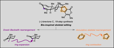 Abstract: Inspired by skeletal editing transformations in the biosynthesis of spiro diterpene pyrones, we herein present an enantioselective total synthesis of the meroditerpenoids breviones B, C, and N. Our synthetic strategy features a series of bio-inspired skeletal editing transformations, including a Dowd–Beckwith ring expansion to construct the seven-membered A-ring, and an annulative skeletal rearrangement that couples terpene and α-pyrone motifs into the spiro diterpene pyrone framework. This latter transformation involves a novel dihydropyran-to-dihydrofuran ring contraction, a strategy that has proven applicable to a diverse range of terpene and pyrone fragments. In addition, during the synthesis, we also developed a SnCl4-mediated intramolecular hydroalkylation of alkenyl β-keto esters, which enables the concurrent assembly of the fused B/C ring system along with three contiguous stereocenters.