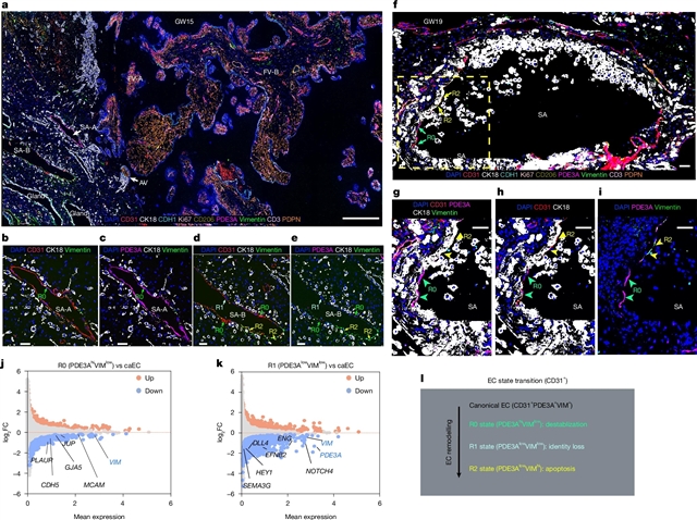 Abstract: The human maternal–fetal interface is characterized by mosaic intermingling of maternal and fetal cells1. Yet the underlying cellular, molecular and spatial programmes remain incompletely defined. Here we generate a comprehensive atlas of the human maternal–fetal interface across normal pregnancies from early gestation to term by integrating large-scale paired single-nucleus transcriptomic and chromatin accessibility profiling with submicrometre-resolution spatial transcriptomics and CODEX multiplex protein imaging2, substantially boosting the spatiotemporal resolution of prior research3. This framework delineates common and transient cell types, states and spatial niches across the fetal and maternal compartments, reconstructs transcriptional programmes that guide cytotrophoblast and decidual stromal cell differentiation, and resolves recurrent architecture structural units that build this interface. We identify previously unrecognized arterial endothelial state transitions during cytotrophoblast-mediated spiral artery remodelling and develop a machine learning model that predicts cytotrophoblast invasiveness from transcriptomic signatures. We further discover a decidual stromal cell subtype that suppresses cytotrophoblast invasion via endocannabinoid signalling at the human maternal–fetal interface. By integrating the atlas with genome-wide association data, we pinpoint maternal and fetal cells that are most vulnerable to pre-eclampsia, preterm birth or miscarriage. This resource provides a comprehensive spatially resolved single-cell multiomic reference of the human placenta and decidua and offers a framework for decoding their normal and disordered development.