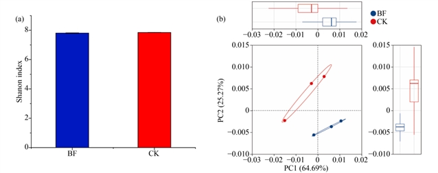 利用香农指数和主坐标分析 (PCoA) 分析了微生物的α和β多样性 (图3)。在两种覆膜情景下,地膜类型并未影响稻田土壤的香农指数,BF和CK之间无显著差异 (图3(a))。然而,PCoA 分析显示,BF和CK之间MP降解微生物的结构存在显著差异 (图3(b))。