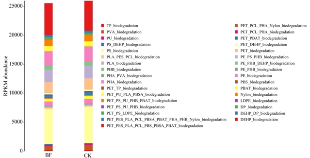 BF和CK中排名前五的MP降解功能组均为PS降解、DEHP降解、PE降解、PE-PS-PHB降解和PET降解(图4)。在基因水平上,DEHP降解中的pcaC、bcrC、ligI,PE降解中的alkR,PE-PS-PHB降解中的paaF、HSD17B10,以及PET降解中的ALDH基因丰度在BF和CK间存在显著差异。