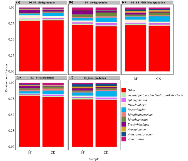图5 不同属对前五位微塑料降解组的相对贡献:(a–e) DEHP, PE, PE-PS-PHB, PET和PS。