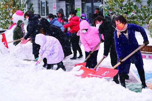 沈阳市气象局公布的数据显示,11月7日至9日沈阳市出现历史罕见的特大暴雪天气过程。据统计,此次是沈阳市自1905年有气象记录以来冬季最强降雪过程。截至9日8时,沈阳市平均积雪深度达34.1厘米,最大积雪深度为41厘米。图为家长带着孩子在沈阳和睦路小学校园内义务扫雪。